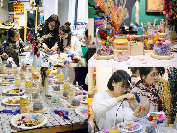 活动现场,花艺师就如何安放主花、固定花瓣、插花造型等步骤和技巧等进行了详细讲解。大家选择好心仪的花材,充分发挥创意和想象力,精心将每一朵花、每一片叶插放和铺贴,使原本朴实无华的花托瞬间花团锦簇、生机盎然。活动中,大家你瞧瞧我的,我看看你的,相互交流搭配心得,在欢声笑语中完成了一份份精美且独一无二的永生花作品。大家手捧亲手制作的永生花合影留念,定格美好瞬间。