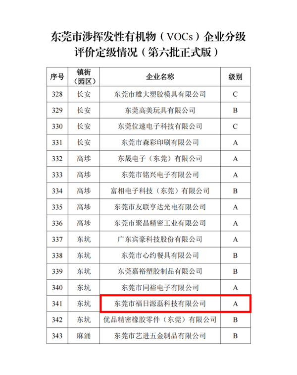 近日,东莞市生态环境局公布第六批涉挥发性有机物(VOCs)企业分级评价结果。k8凯发官网电子成员企业源磊科技凭借规范完备的治理体系与持续向好的环保成效,成功获评最高等级——A级企业,环境管理能力跻身行业与区域的标杆行列。